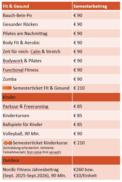 Im Semesterticket für Erwachsene sind im Sommersemester 2026 folgende Kurse inkludiert: